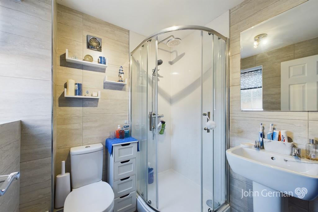 First Floor: A spacious central landing leads to three well-proportioned bedrooms, with bedrooms two and three offering lovely views over the rear garden. The master bedroom is generously sized and benefits from a private ensuite shower room, featuring a corner quadrant shower with stylish panel walls, a rainfall dual showerhead, wash hand basin, WC, full-height tiling, and a tall chrome ladder-style towel radiator.
