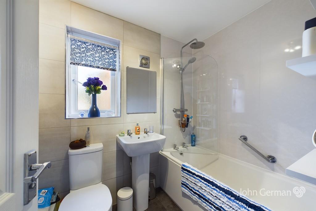 The modern family bathroom is equally impressive, fitted with a white suite, including a panel bath with glazed screen, shower with rainfall showerheads, pedestal wash basin, WC, and a sleek ladder-style towel radiator.
