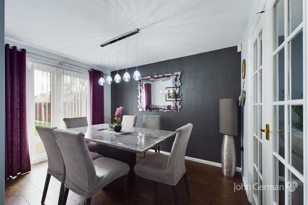 The main living room overlooks the front elevation and the tree lined nature walk via a large bay window, a fireplace forms the focal point of the room fitted with a living flame gas fire with marble hearth and background and wooden surround plus Karndean flooring that continues through into the dining room accessed via glazed double doors leading into the dining room which in turn has French doors leading out onto the rear patio along with a glazed internal door back through to the hallway.
