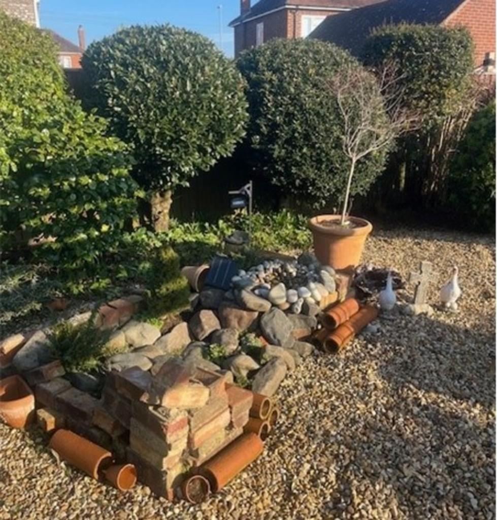 External lighting, cold water tap, electric socket, patio area with gravelled area, shrubs and trees leading round to: