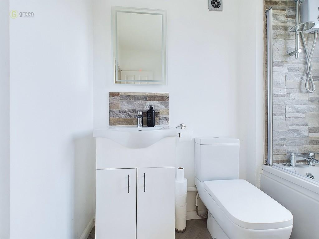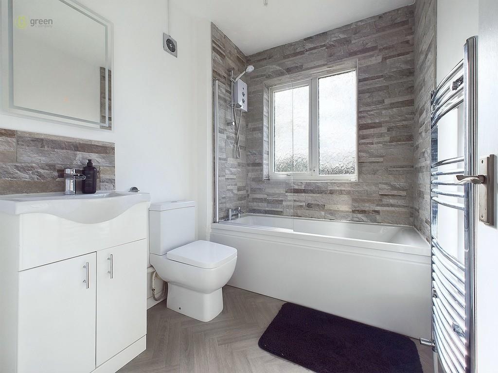 BATHROOM Benefits from being refitted with slate style wall tiles, sensor mirror, vanity unit, WC, bath, bath screen, electric shower, heated towel rail, window to rear.