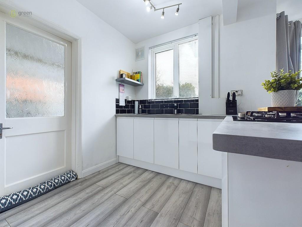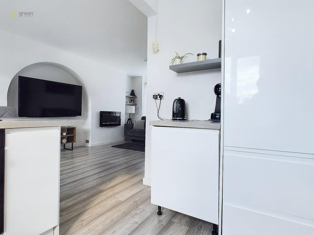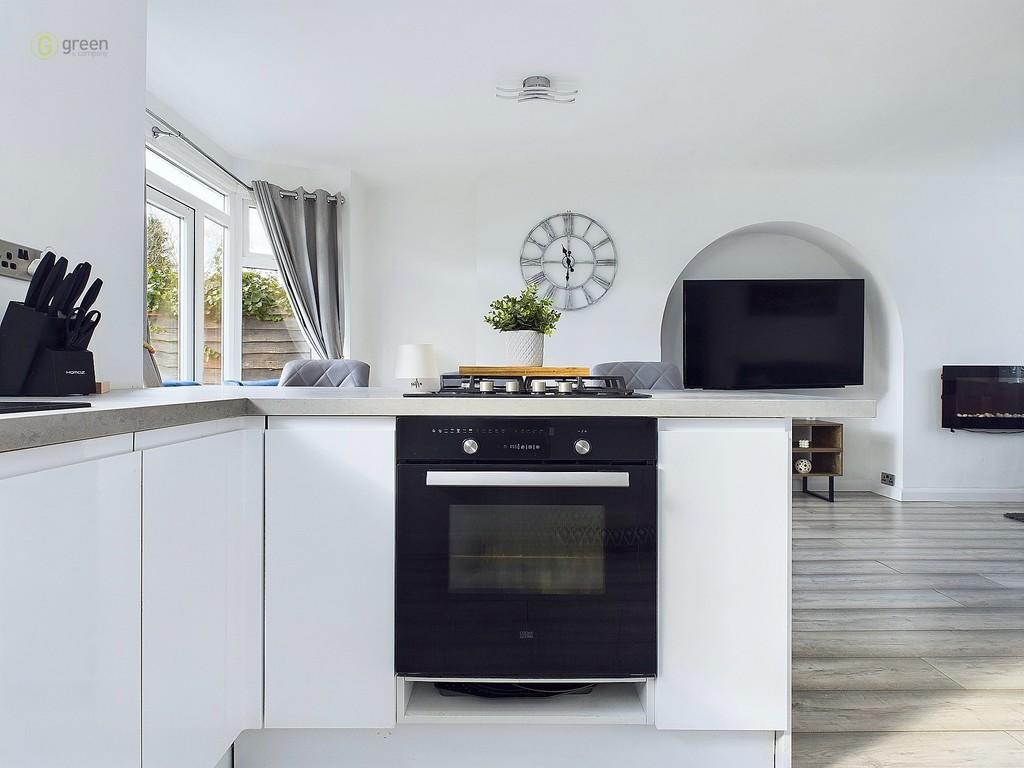 KITCHEN 6' 3" x 10' 0" (1.91m x 3.05m) Open plan from lounge diner with laminate flooring, breakfast bar, gas hob, window to rear, blinds, oven, metro style wall tiling, modern units, sink, lighting and door to:-