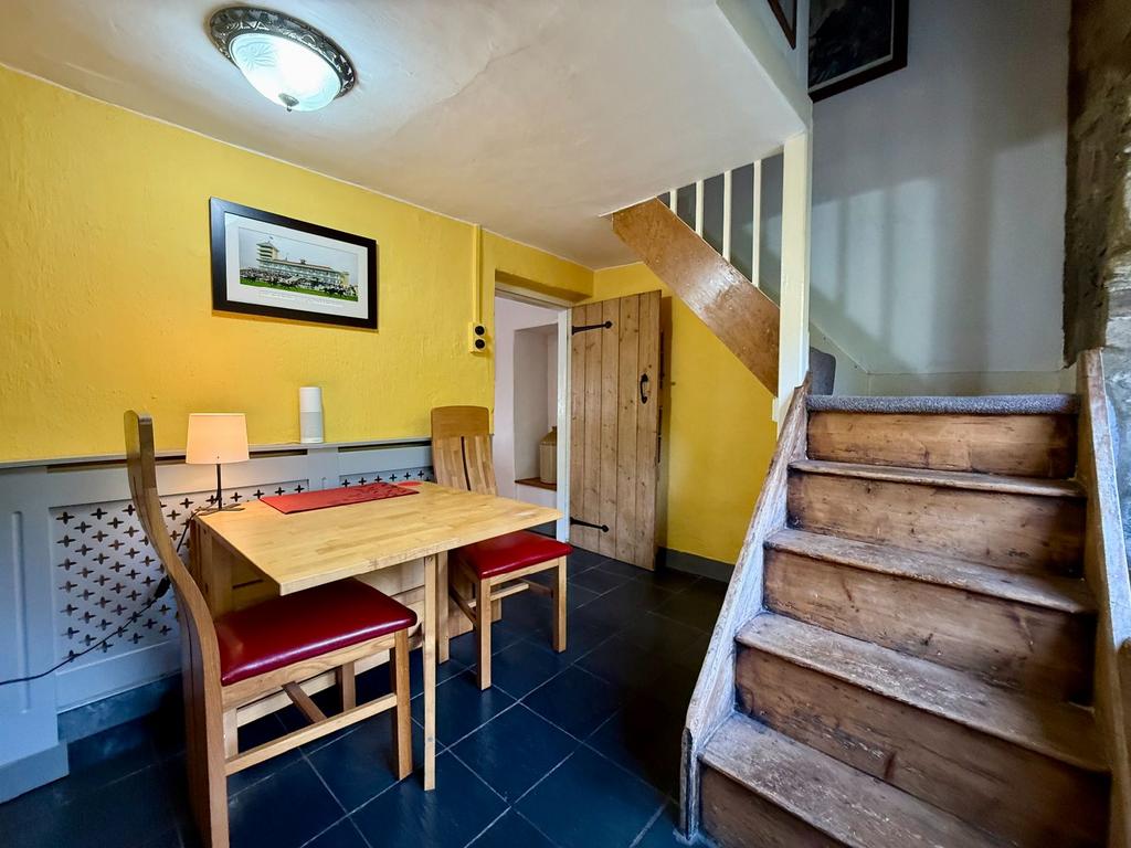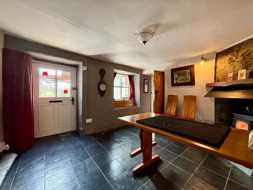 Door and window to rear, exposed stone wall, staircase leading to first floor, under stairs storage, radiator, slate tiled flooring, opening into:-