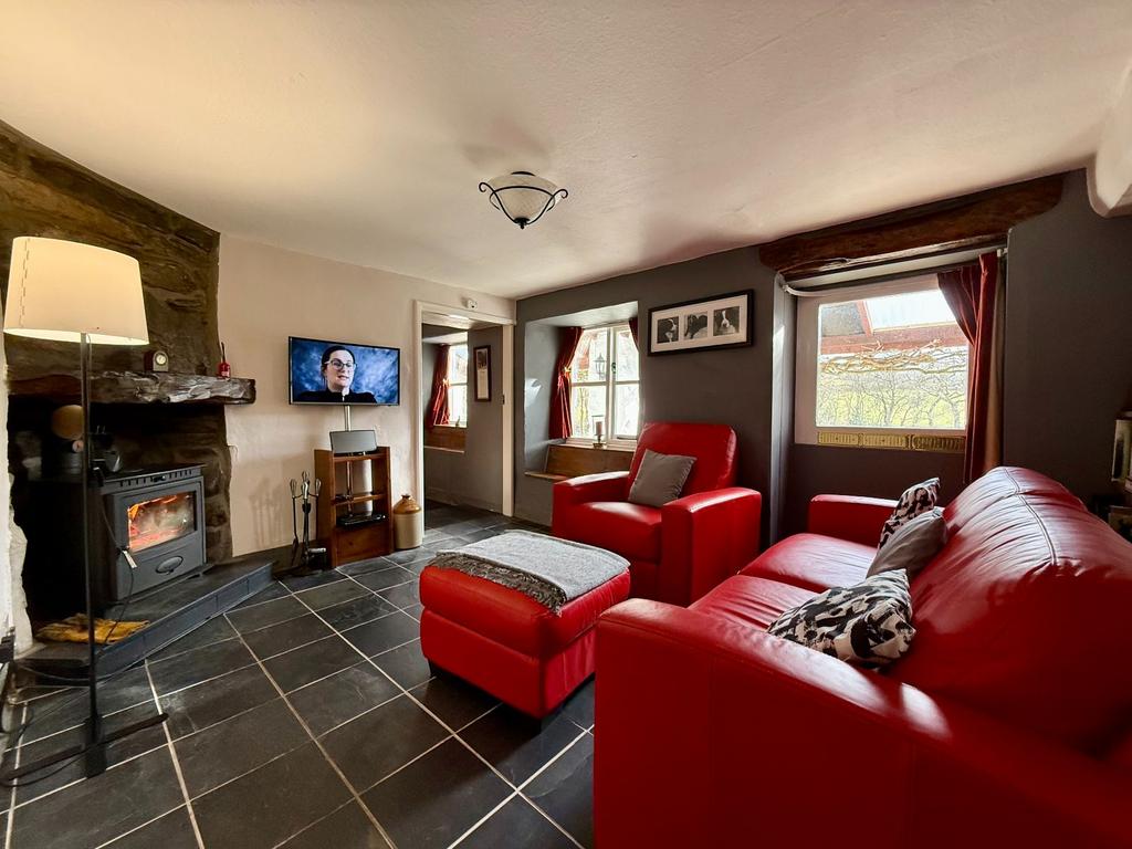 Two windows to front, one with a window seat, corner feature fireplace housing wood burning stove on a raised slate hearth, slate tiled flooring. Door into:-