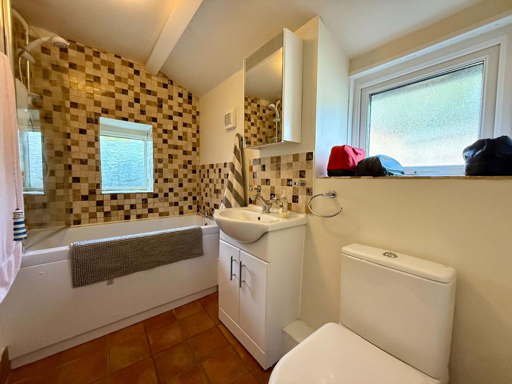 Window to side and window rear, panelled bath with electric shower, shower screen, partly tiled walls, vanity wash hand basin with mirrored unit over, low level WC, towel rail, quarry tiled flooring.