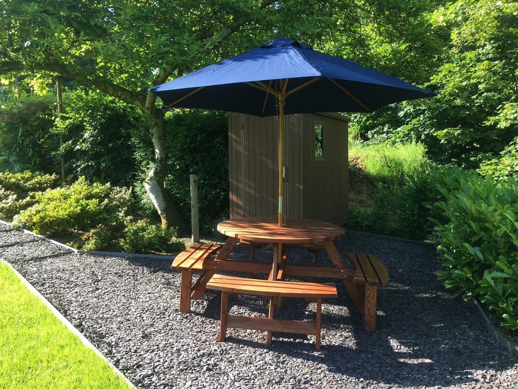 A stone pillared veranda, framed by a beautiful and established Wisteria plant, part slated and corrugated roof, seating area enjoying views across the country lane and distant countryside. Door leading into the workshop.