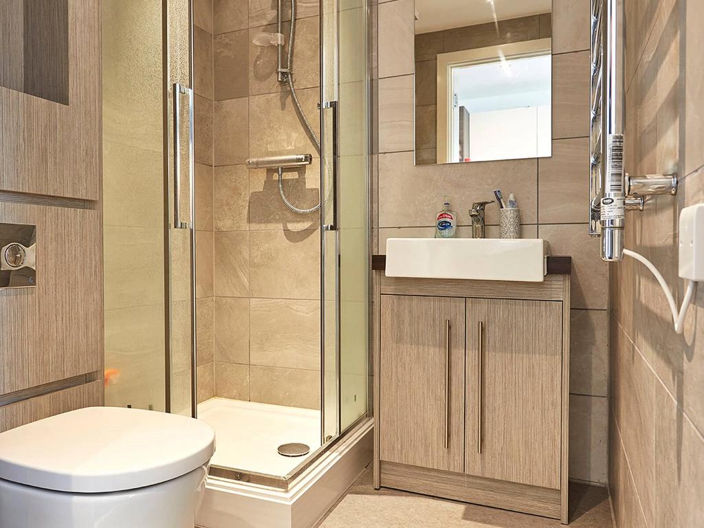 The modern and premium bathroom comes with a fully tiled bathroom, equipped with a spacious shower, heated towel rail and integrated storage.