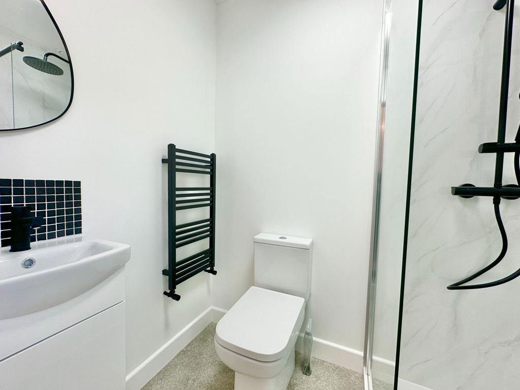 EN-SUITE SHOWER ROOM (1.95 m x 1.3 m):- The newly installed en-suite has been furnished with a WC, wash hand basin with fitted cupboard, large walk-in shower cubicle with mains fed rainfall shower, heated towel rail and extractor fan.