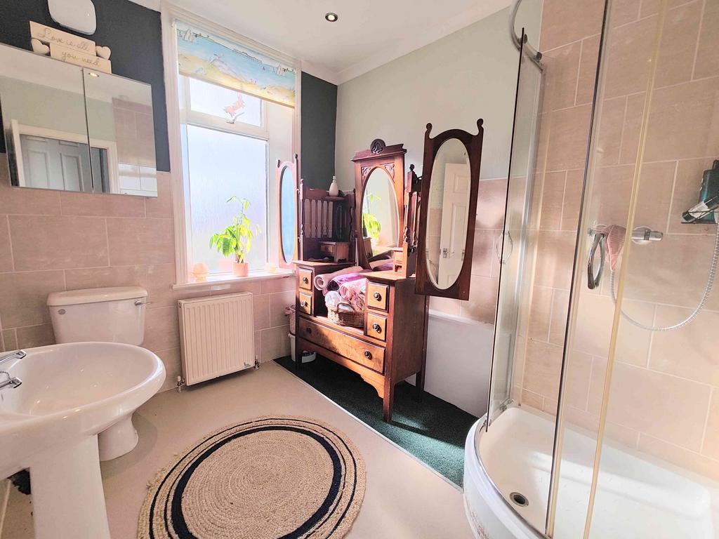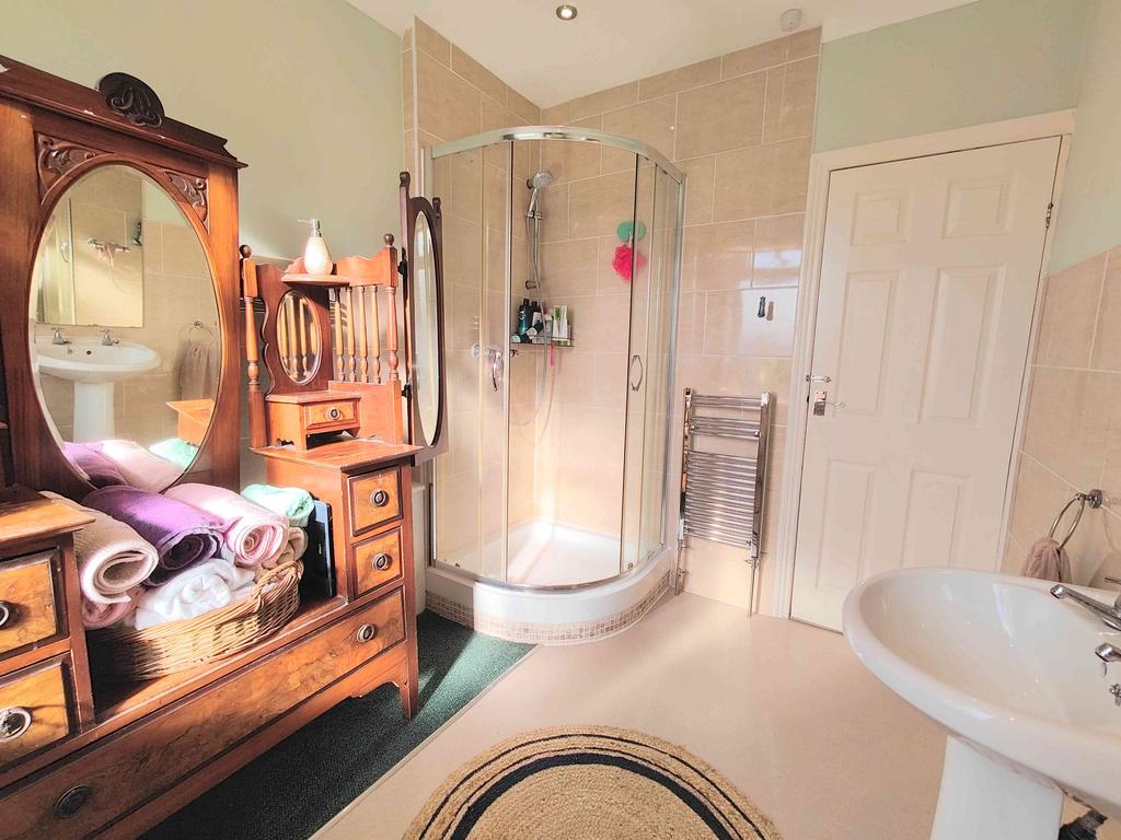 A well laid out house shower room that makes excellent use of the space on offer to create a highly functional and stylish room. With a corner shower cubicle, vinyl floor, tiled splashbacks, pedestal washbasin, low flush toilet, frosted uPVC double glazed window to the front elevation, ceiling inset spotlights and an extractor fan.