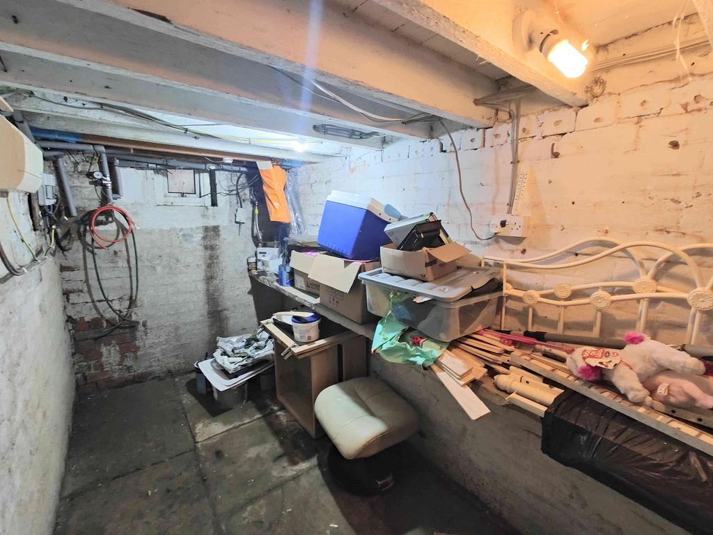 A spacious cellar storage area with its stone floor, stone shelving, central light fitting and frosted uPVC double glazed window to the front elevation.