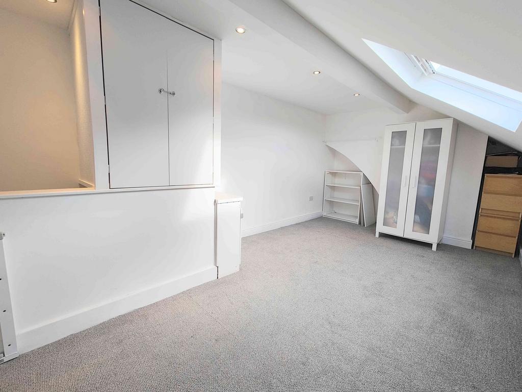 A rather spacious second bedroom, offering space for a double bed with additional bedroom furniture. This room also benefits from eaves storage via two doors to the front of the room. With a carpeted floor, beamed ceiling, single radiator and Velux style window.