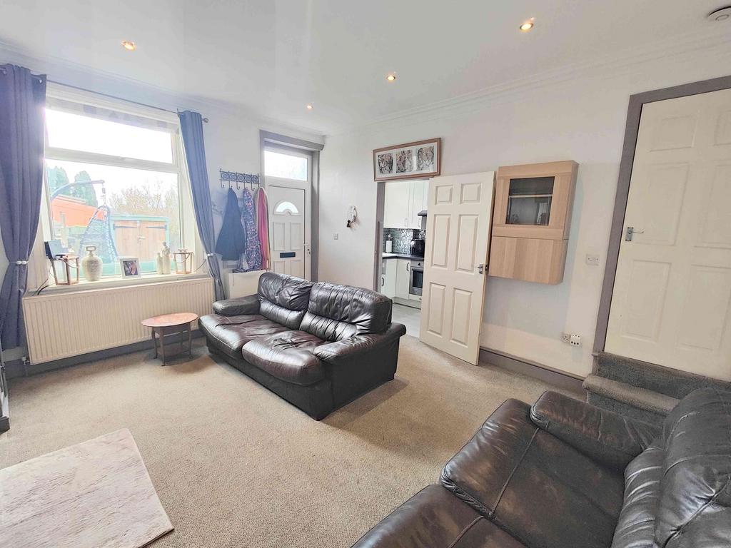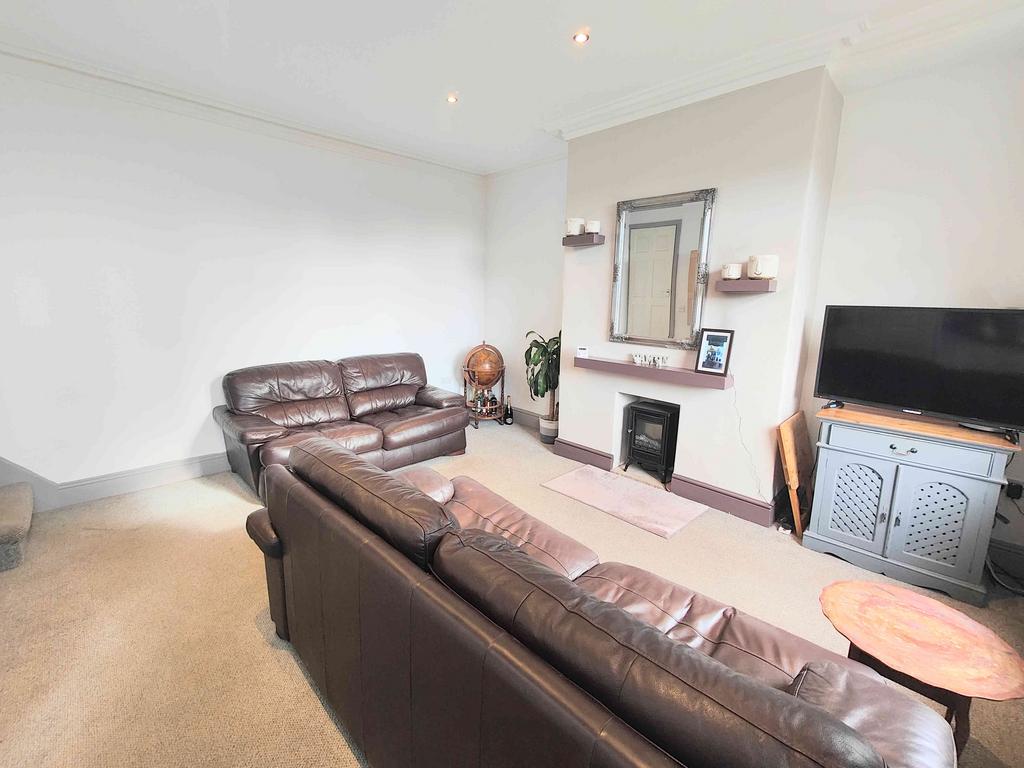 A light, bright and spacious living room that offers the ideal communal space for the property, offering plenty of room for a three piece suite. An electric fireplace, on a tiled hearth and with wooden mantelpiece, offers the ideal central feature for the whole room. A light and bright space owing to the numerous ceiling inset spotlights and the uPVC double glazed window, to the front elevation, in addition to the transom window. With a carpeted floor, cornice to ceiling, double radiator and television access point.