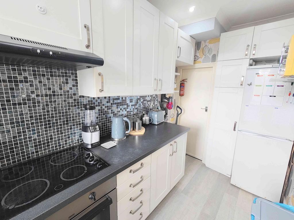 A well laid out kitchen, featuring laminated work surfaces to two walls, all with over and under counter cupboards and drawers. With an integrated hob, integrated oven, plumbing for a washing machine, space for a fridge/freezer, uPVC double glazed window to the front elevation, ceiling inset spotlights, vinyl flooring, tiled splashbacks, extractor hood and a 1 ½ sink with stainless steel mixer tap.