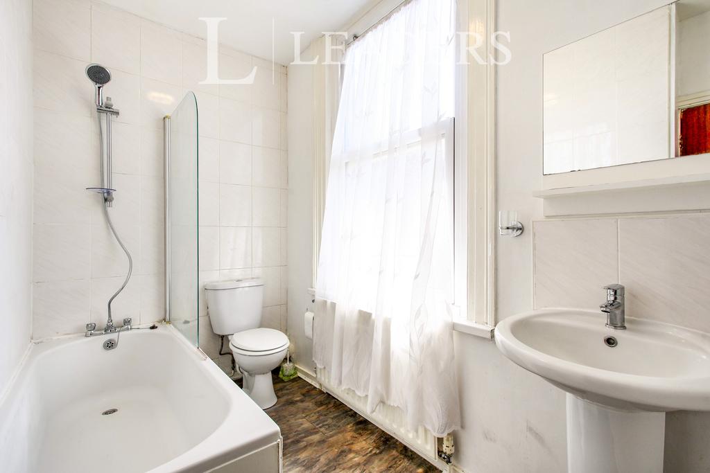 Bathroom - Frosted window to the rear, vinyl flooring, part tiled walls, white three peice suite with shower over the bath, pedestal hand basin and W/C.