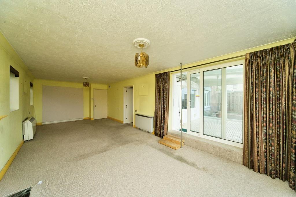 Living/Dining Room - Offering generous space for furniture for both living and dining, with a double glazed window, carpeted flooring, a feature fireplace housing a gas fire with a decorative surround, and a set of French doors to the kitchen.