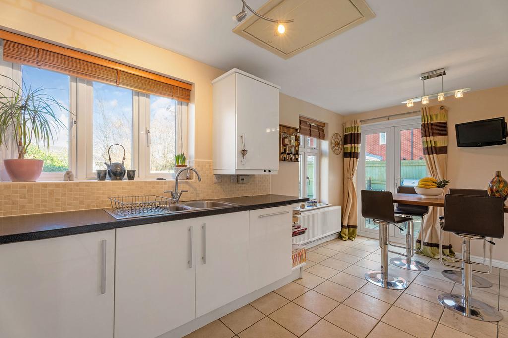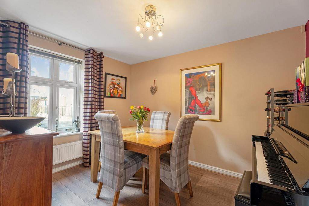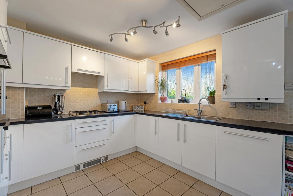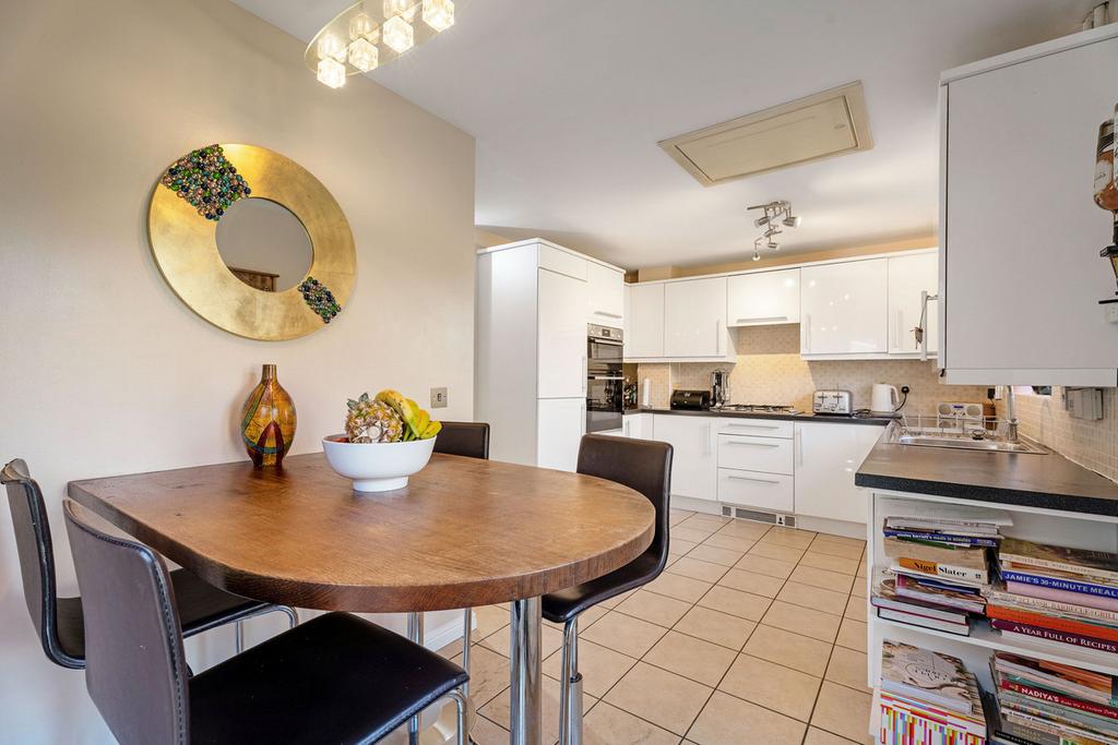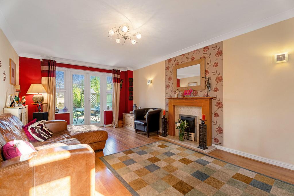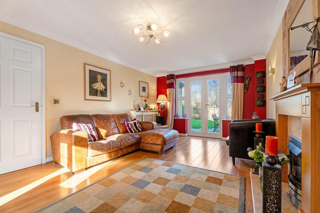 The accommodation is arranged over three floors and is beautifully presented throughout. The ground floor features a welcoming entrance hall, a cloakroom, and a utility room with access to the garage and garden. A bright and spacious dual aspect living room with patio doors and a feature fireplace. A well-appointed kitchen with breakfast bar, fitted appliances and patio doors leading to the generous garden.