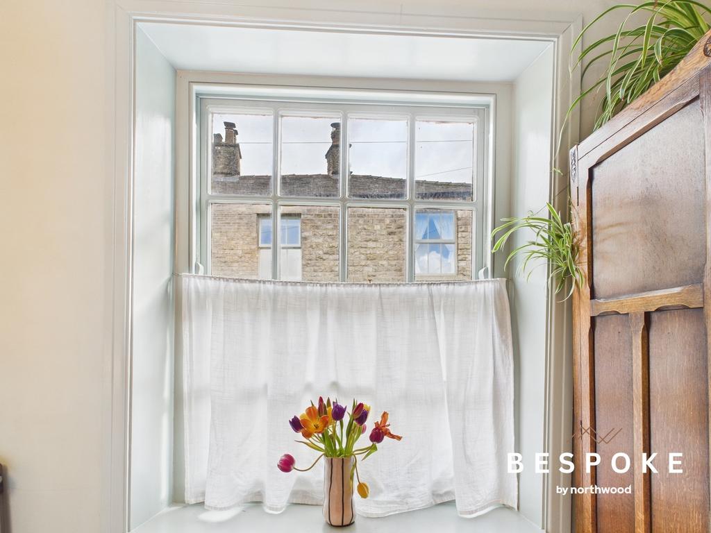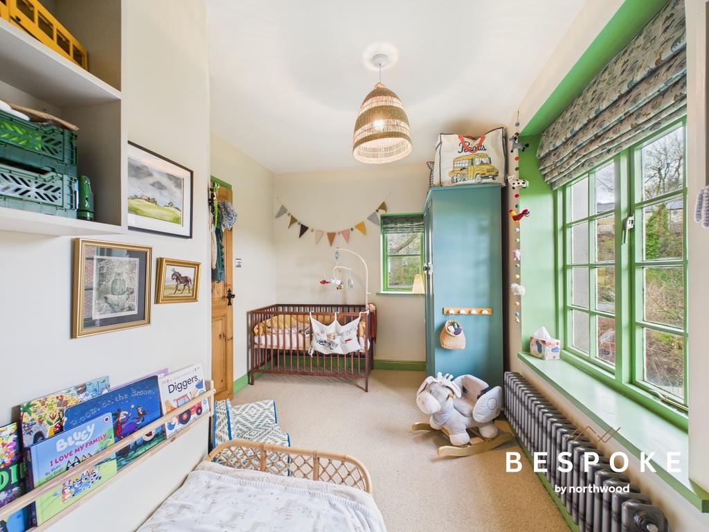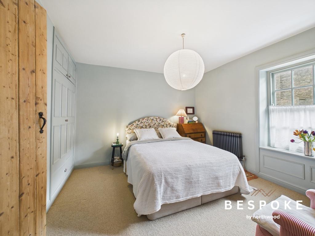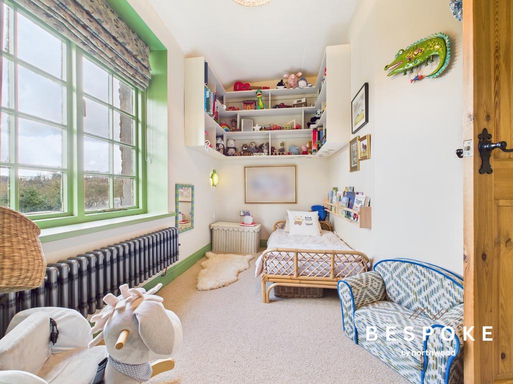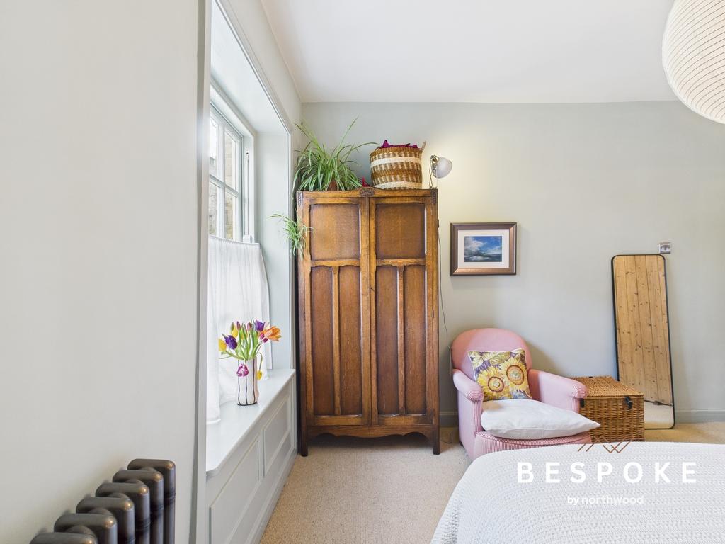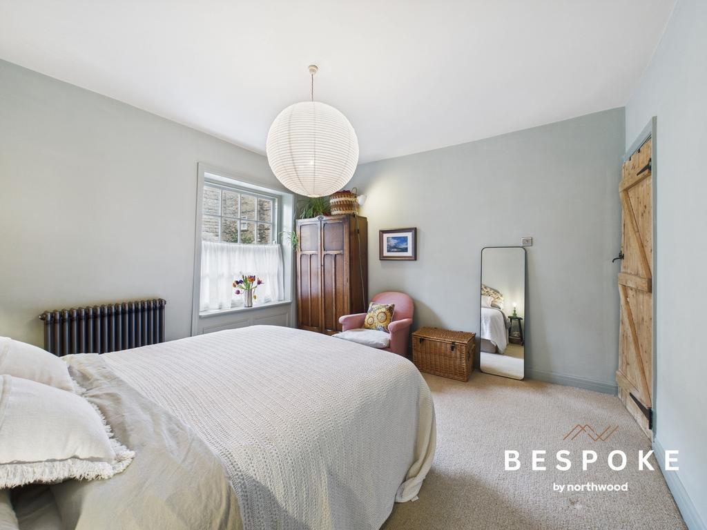 A dual-aspect room capturing views over the garden towards Bollington High Street, this bedroom is filled with natural light. A raw metal column radiator and fitted carpets enhance the sense of comfort and style.