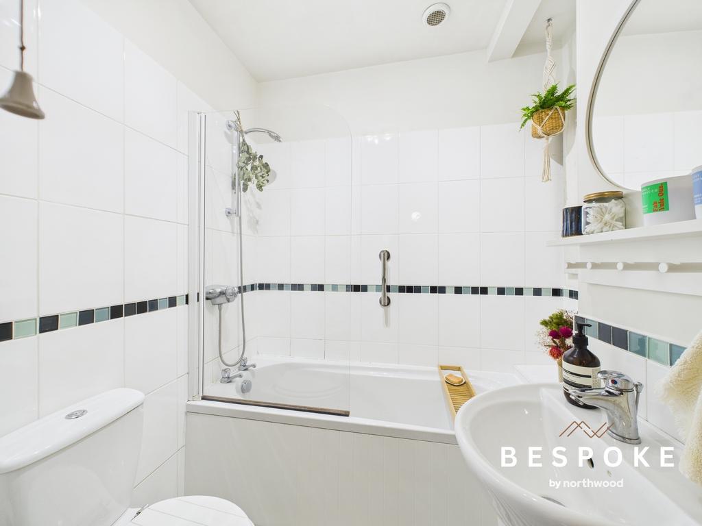 The bathroom features tiled flooring, part-tiled walls, a bath with an overhead shower, WC, wash hand basin, towel radiator, extractor fan, and spot lighting.