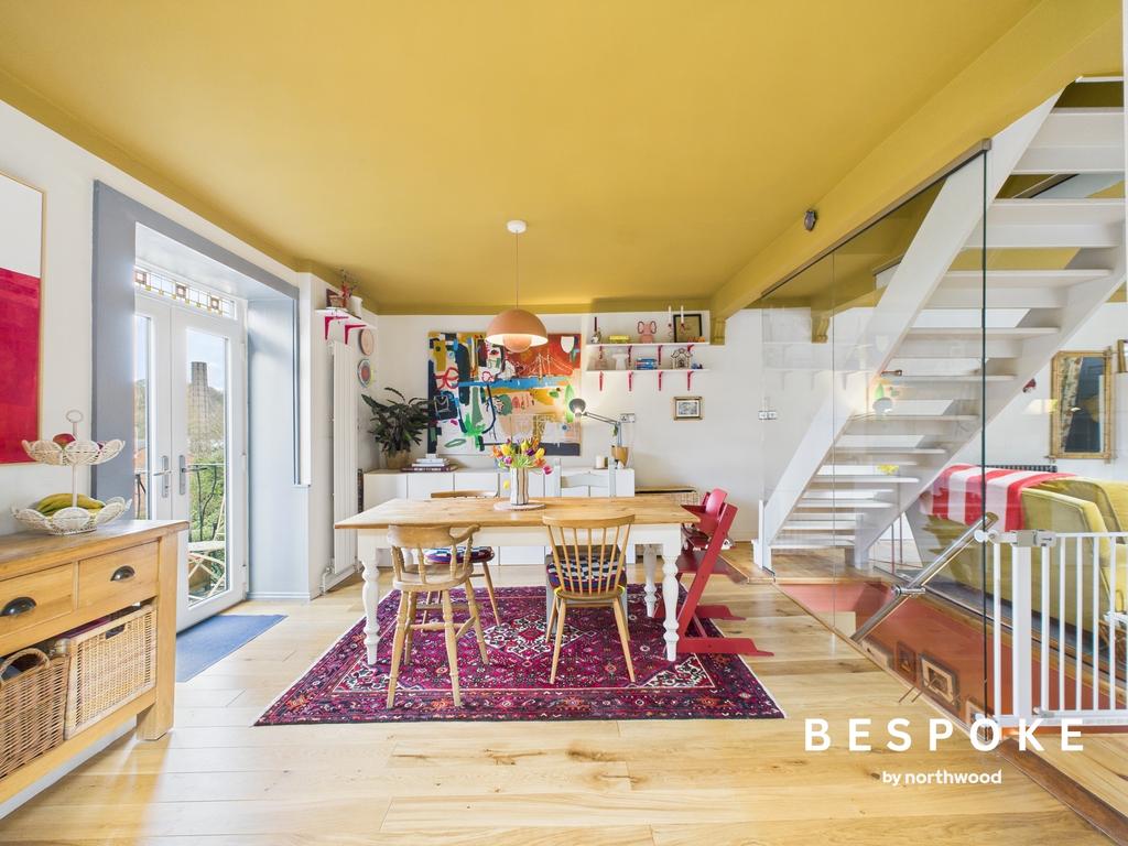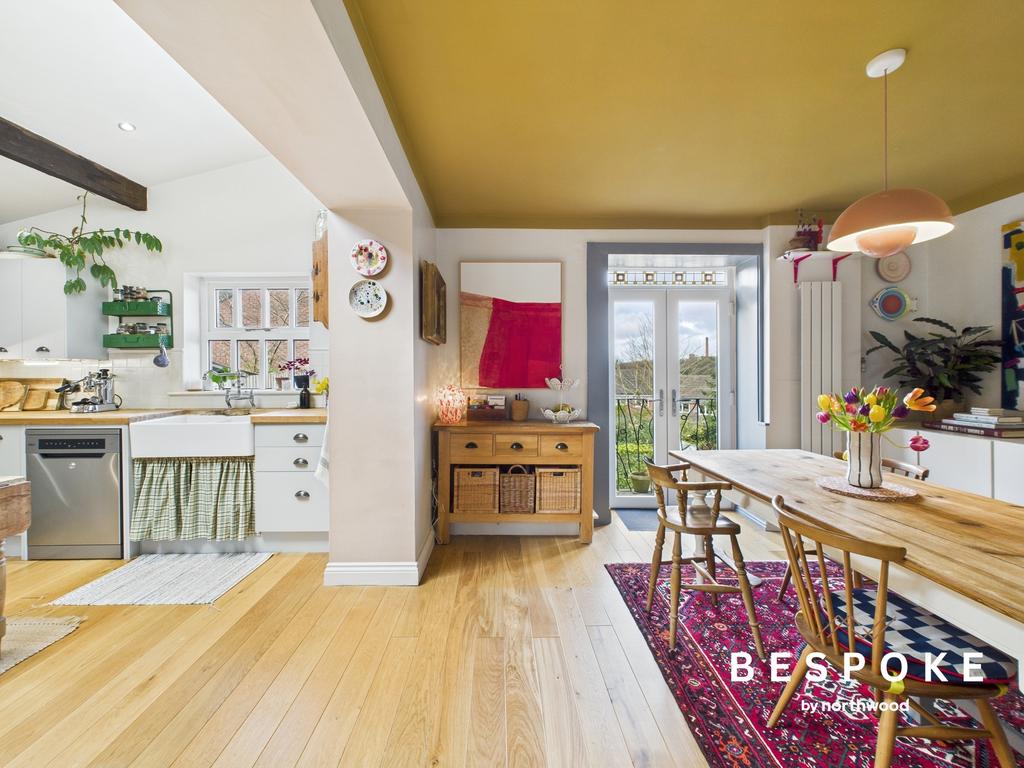 With engineered oak flooring and floor-to-ceiling column radiator, the dining area is both practical and inviting. French doors open onto the balcony, an idyllic spot to take in the picturesque surroundings. A flat archway leads seamlessly into the kitchen, where traditional materials meet contemporary design.