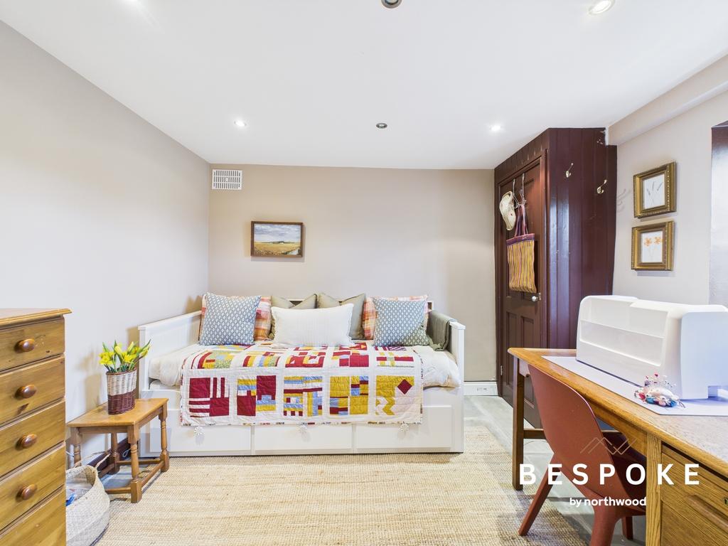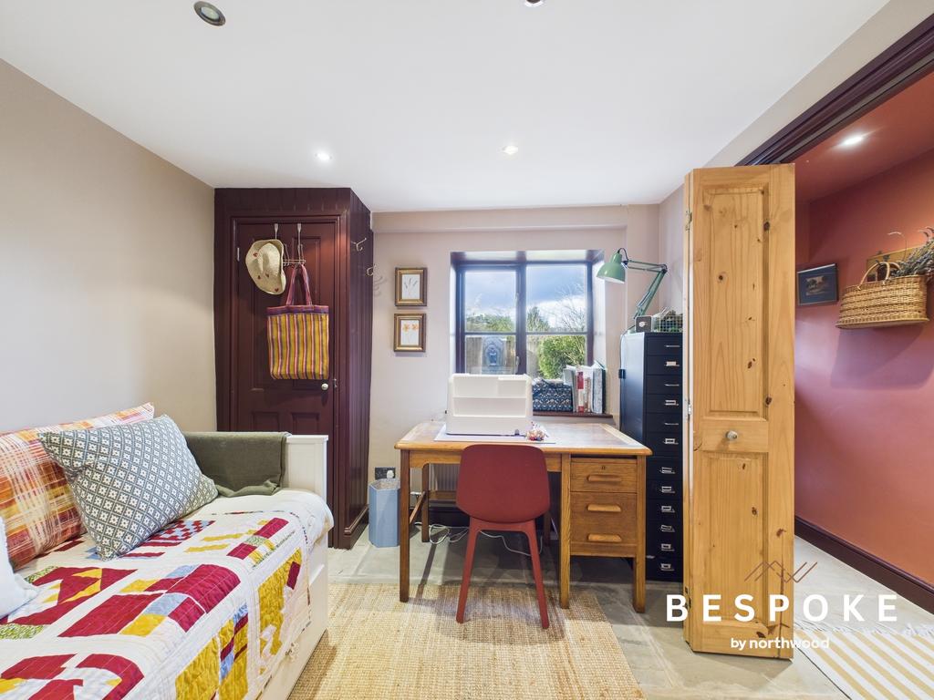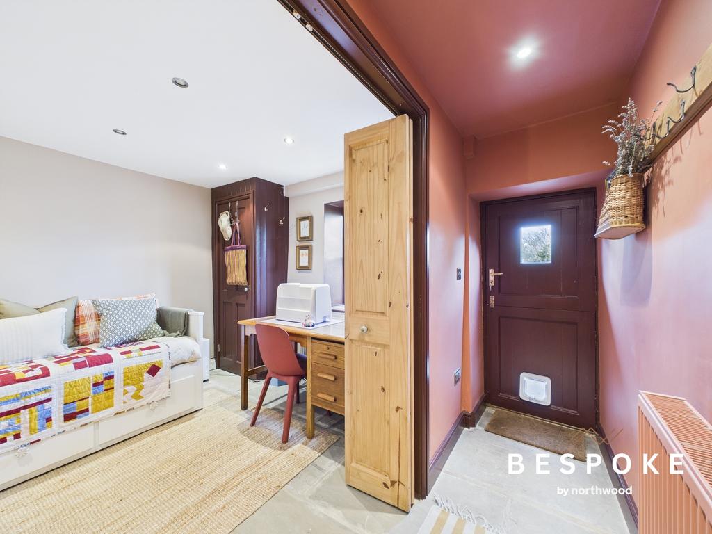 With York stone flooring, spot lighting, and bi-fold doors, this adaptable space offers an abundance of practicality. A window looking into the garden and built-in storage cupboard complete the offering.