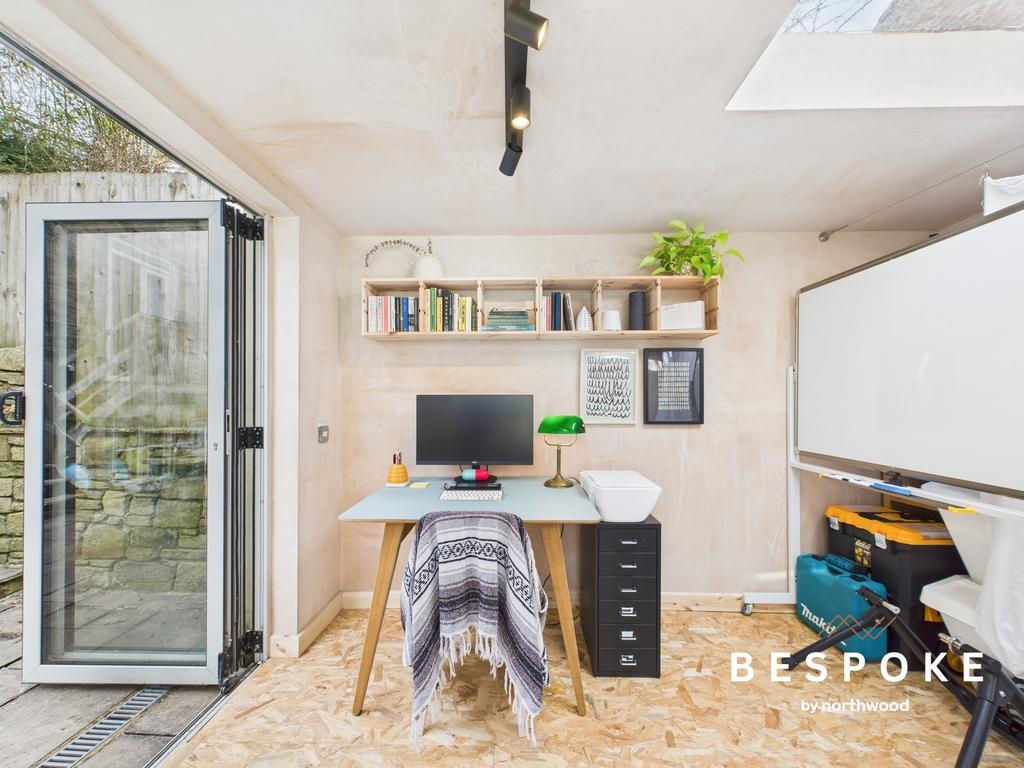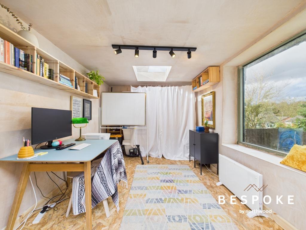 An exceptional addition to the home, this self-contained versatile studio. Bi-fold doors, a skylight, side window, spot lighting, and electricity points make it ideal for a home office, creative space, or gym. Freshly plastered, it’s ready for the new owner to make it their own.