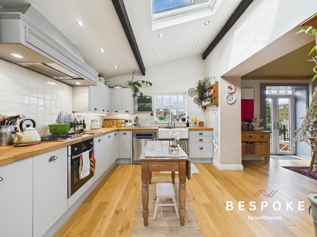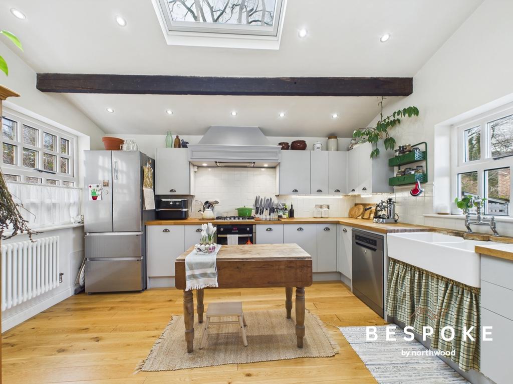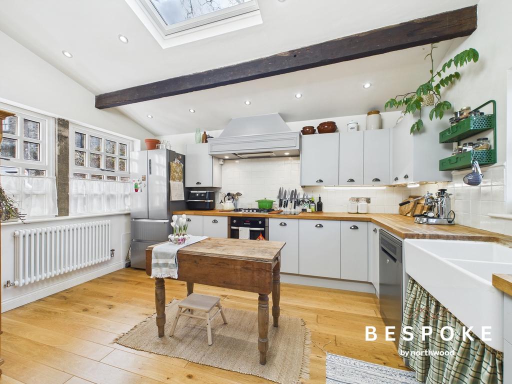 Bathed in natural light from a dual-aspect layout and a striking skylight, the kitchen is as stylish as it is practical. A twin Belfast sink sits within a butcher block work surface, complemented by a tiled splashback and matching drawer, eye, and base-level units with under-counter lighting. Exposed timber beams and a cast iron column radiator add a touch of heritage, while integrated space for a fridge freezer and dishwasher enhances functionality.