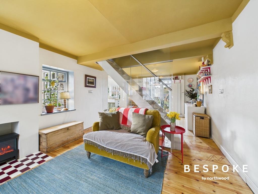 A six-panel timber door with stained glass opens into a space filled with warmth and elegance. Dual-aspect sash windows allow light to dance across beautifully restored floorboards, while a traditional tiled hearth adds to the charm. A raw metal column radiator and pendant lighting provide a stylish contrast, with a glazed partition subtly defining the space as it flows into the dining area.
