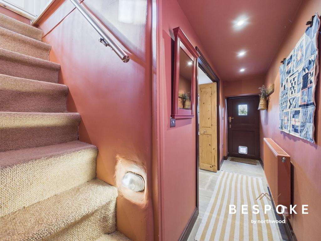 Descending via a rustically lit staircase, the lower ground floor unfolds with York stone flooring, a stable door leading to the garden, spot lighting, and a central heating radiator.