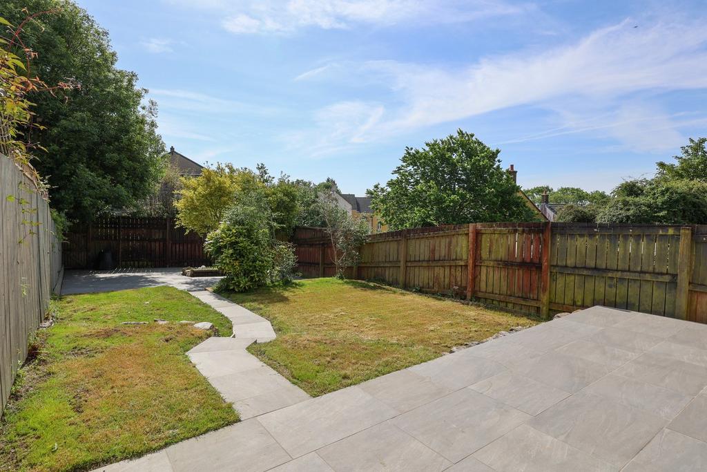 At the front of the property, there is a generous parking area with space for three cars, complemented by a pathway to the left that leads to the rear. The rear garden is notably larger than others in the development, featuring a light grey porcelain patio area with a matching pathway that extends to a much larger patio at the base of the garden. Between the two patio areas is a spacious, well-maintained lawn, perfect for outdoor activities and family gatherings.