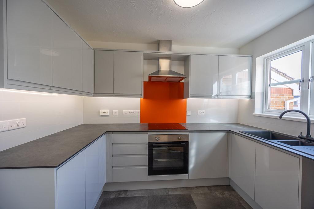 9' 10" x 7' 3" (3.00m x 2.21m) Newly fitted, this kitchen features a range of sleek pale grey-fronted base units and high-level cupboards, complemented by square-edge work surfaces and easy-to-clean vinyl splashbacks. It includes a built-in oven, hob, and stainless steel extractor, along with space and plumbing for a washing machine and space for a fridge/freezer. A window to the front allows natural light to brighten the space.