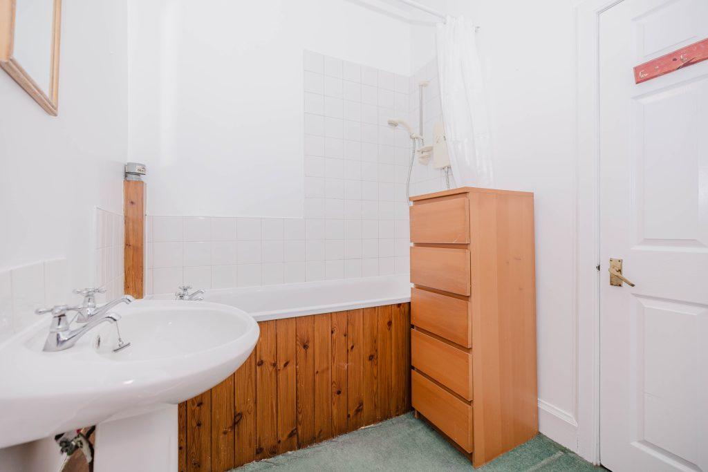 ~Bathroom with three-piece suite including electric shower over bath and tiled splashback