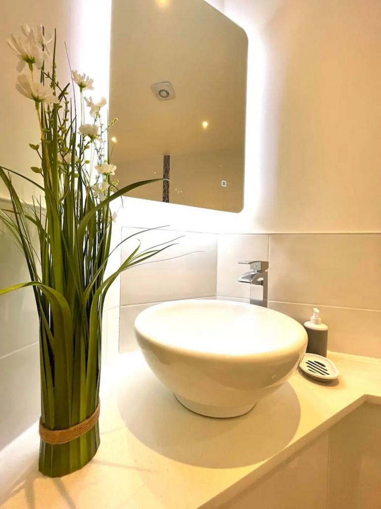 There is a pristine bathroom in the apartment, each designed with modern fixtures and finishes, complete with walk-in showers, ample lighting, and vanities, plus a separate Cloakroom.