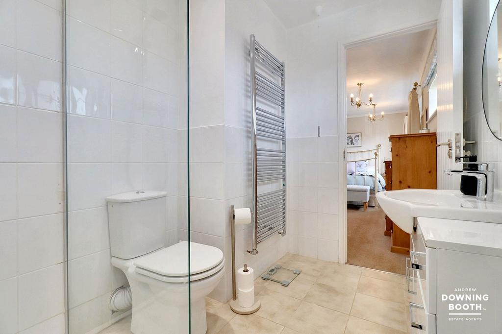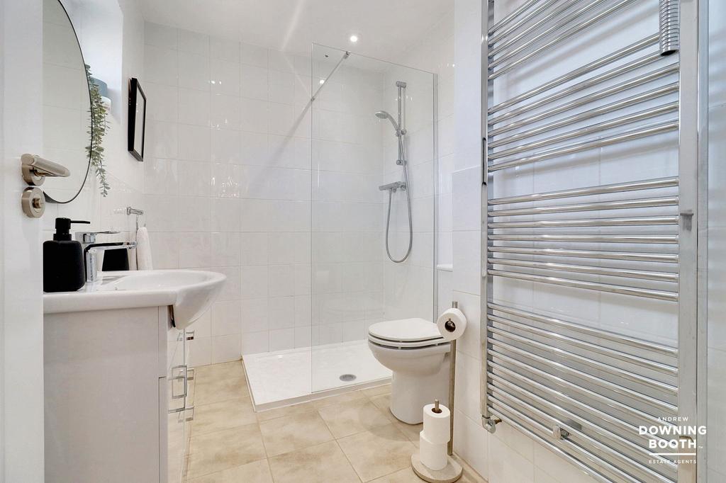 A stunning en-suite shower room is fitted with a contemporary white suite, including a low-level flush WC, integrated wash hand basin with chrome mixer tap, and a walk-in shower enclosure. There is also a wall mounted chrome heated towel rail, recessed ceiling spotlights, two front facing UPVC double glazed windows, tiled flooring and predominantly tiled walls.