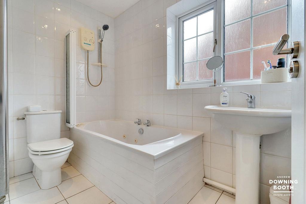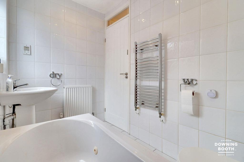 A fabulous family bathroom is fitted with a white suite, including a low level flush WC, pedestal wash hand basin with chrome mixer tap, and a bathtub with Jacuzzi-style jets and Bristan shower over. There is also a wall mounted chrome heated towel rail, recessed ceiling spotlights, a side facing UPVC double glazed window and both fully tiled walls and flooring.