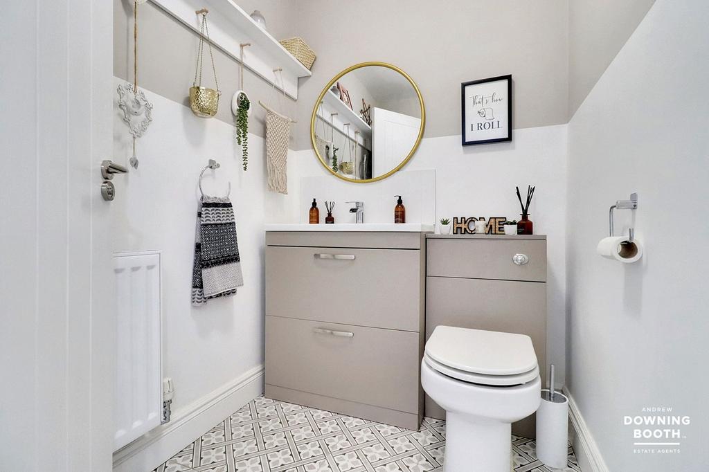 A contemporary guest WC is fitted with an integrated low-level flush WC and integrated wash and basin with chrome mixer tap. There is also a radiator and Minton-style tiled flooring. This room is large enough to be used as a ground floor shower room if desired.