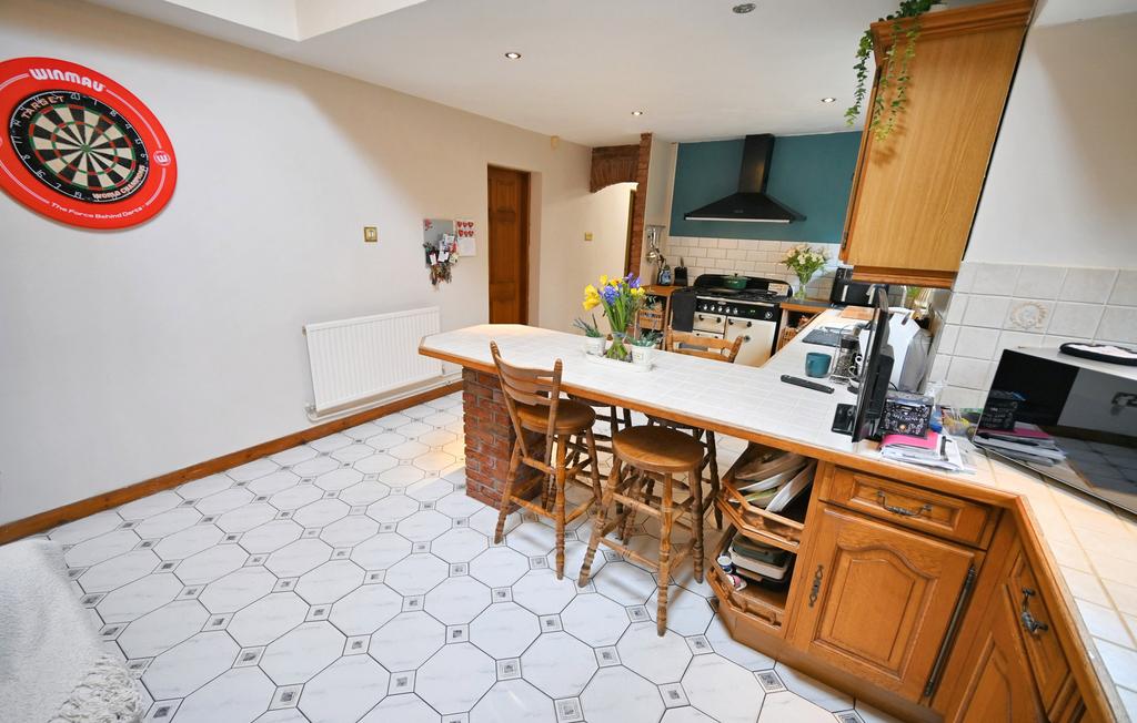 Breakfast Kitchen: 19’9’’ (6.01m) x 11’1’’ (3.37m) Fitted with a traditional suite of matching units comprising an extensive range of base cupboards, drawers & suspended wall cupboards, tiled worktops including breakfast bar, 1½ drainer sink unit, recess & gas point for Range style cooker, built in dishwasher, radiator, vaulted ceiling with recessed ceiling spotlights, tiled flooring, hard wood double glazed windows to side and open archway to utility.