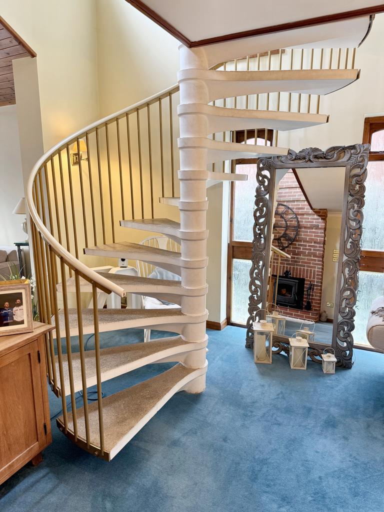 - From the living room, a cast iron spiral staircase leads to the first floor where the mezzanine style landing leads to the large master bedroom, well-appointed ensuite bathroom & further bedroom.