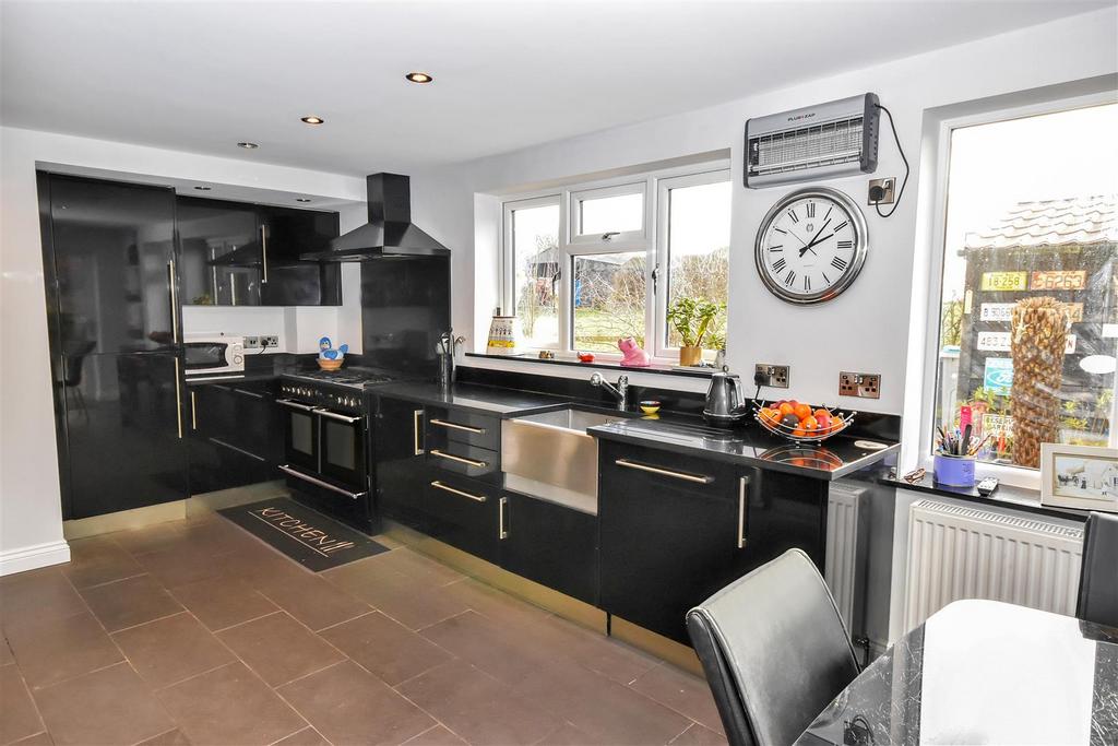 Open Plan Dining Kitchen - 6.12m x 3.20m (20'1 x 10'6) - Two uPVC double glazed windows to the rear elevation with views of the countryside, uPVC bifold patio doors to the side which gives access to the driveway, radiator and ceramic tiled floor. A range of modern gloss finish kitchen units comprise, base cupboards and drawers, tall units and cupboards, granite working surfaces with stainless steel Belfast style sink with mixer tap and sprayer, space for an American fridge freezer. A set of Oak framed glazed centre opening doors lead to the living room.