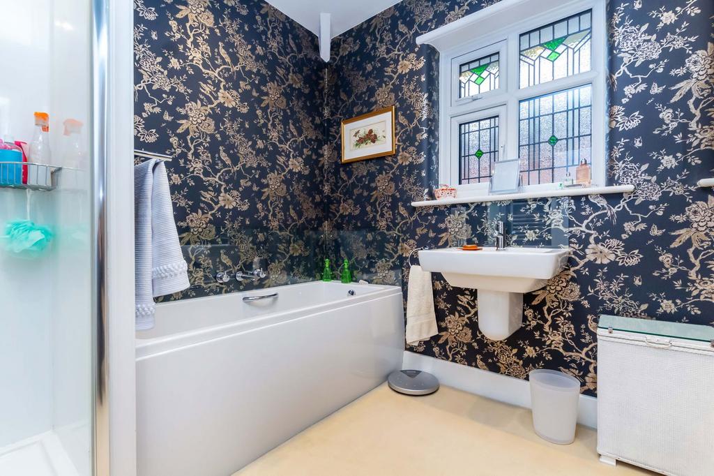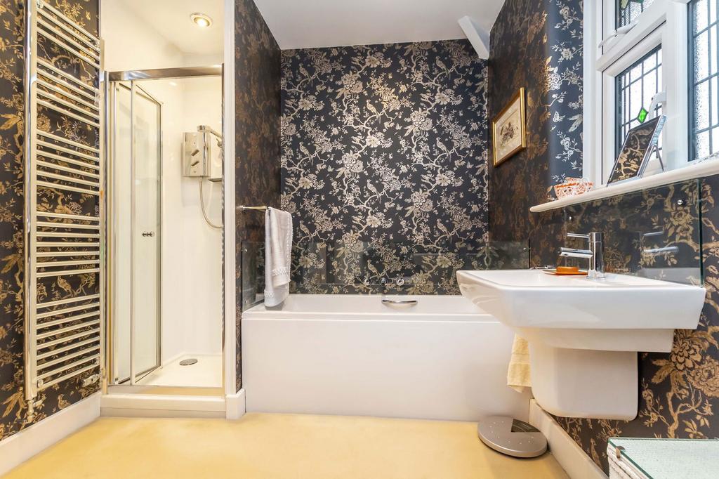 Upvc double glazed window, four piece modern white suite comprising of low level WC, wash hand basin with mixer tap and glazed splashback, twin grip panelled bath with contemporary style central mixer tap and glazed splashback, step in shower enclosure includes electric shower with glazed folding shower door, fitted corner linen cupboard and ladder style chrome heated towel rail. Recessed spotlighting and extractor.