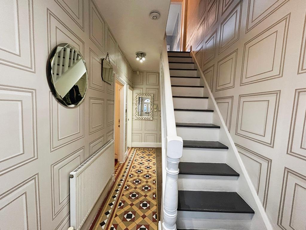 This hallway is a stylish and welcoming entrance that blends classic charm with modern touches. The vintage-style tiled flooring adds character, while a white-painted staircase with contrasting dark treads create a striking focal point. Practical storage keeps the space tidy, ensuring a well-organised and inviting first impression.