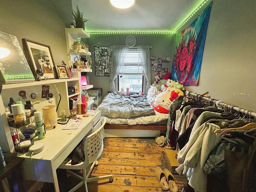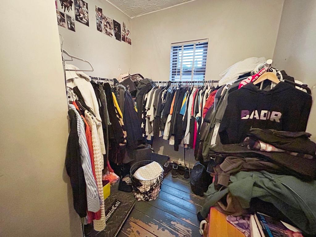 This third bedroom is a compact yet functional space. The neutral wall tones provide a blank canvas for various styling options, while the original wooden floorboards add character. This room is ideal for use as a bedroom, home office, or dressing room, offering flexibility to suit different needs.