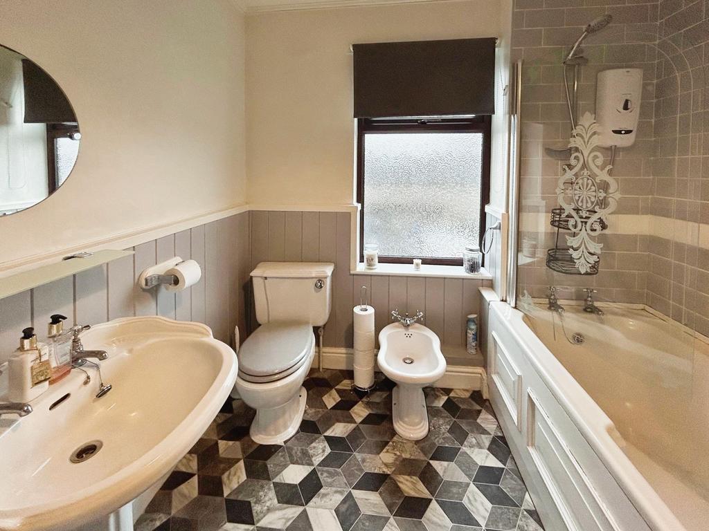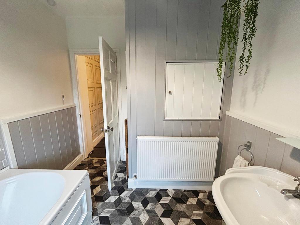 This family bathroom combines traditional charm with modern touches. The room features a full-sized bath with an overhead shower and glass screen, providing both convenience and comfort. A classic pedestal sink and high-level WC add to the period feel, while a bidet offers additional practicality. The walls are finished with half-height wooden panelling in a soft grey tone, complemented by sleek tiled accents around the bath. The geometric-patterned flooring adds a contemporary touch, enhancing the overall design. A large frosted window allows for plenty of natural light while maintaining privacy.