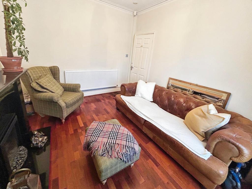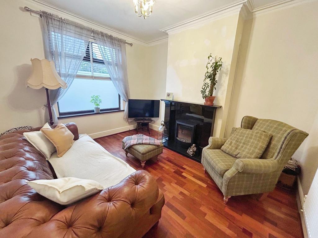 This lounge is a warm and inviting space. The rich wooden flooring adds warmth and character, complementing the neutral wall tones. A large window allows plenty of natural light to enter, creating a bright and airy atmosphere. The room features a fireplace with a sleek black surround, adding a cosy touch. High ceilings and decorative coving enhance the sense of space, giving the room an elegant feel.