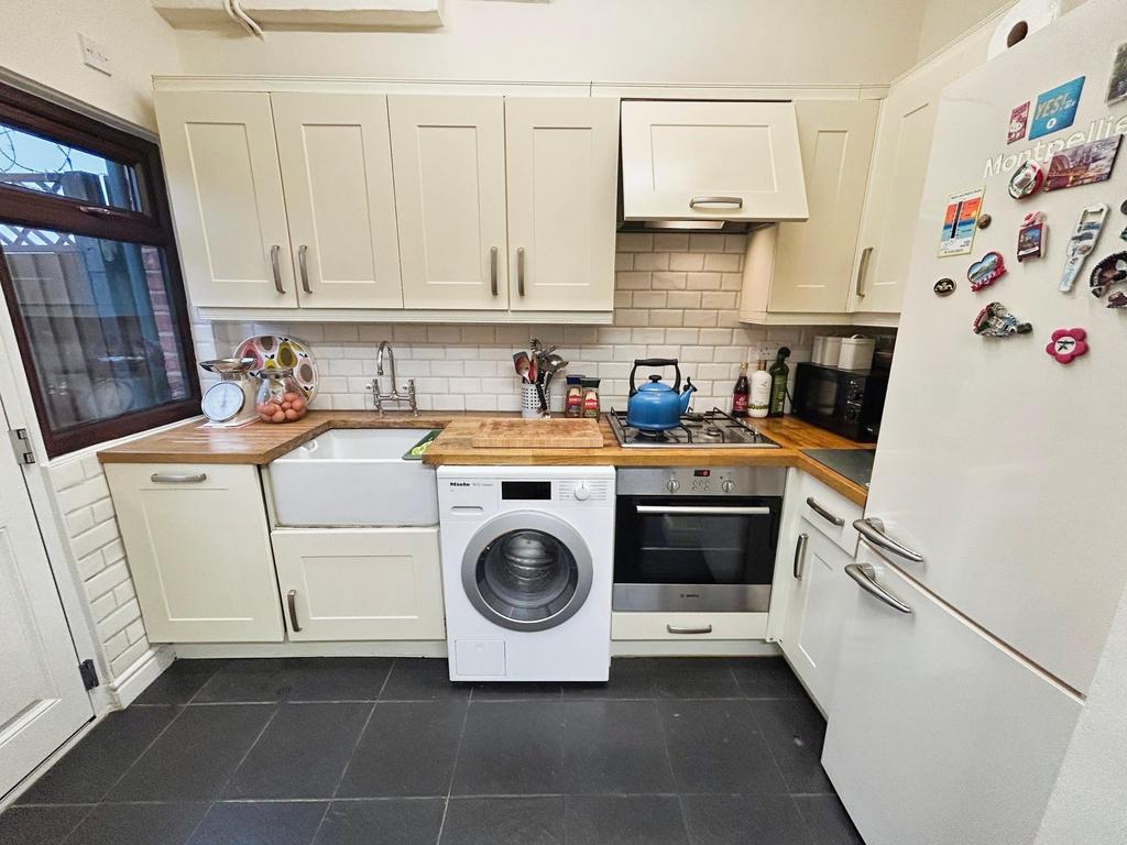 The cream shaker-style cabinets provide ample storage, complemented by wooden worktops that add warmth and character. A white subway tile backsplash enhances the clean and timeless look. The dark tiled flooring contrasts beautifully with the lighter cabinetry, creating a stylish and easy-to-maintain surface. A Belfast sink adds a traditional feature, while integrated appliances contribute to the seamless design. Natural light enters through a large window and a back door, which provides convenient access to the rear garden.