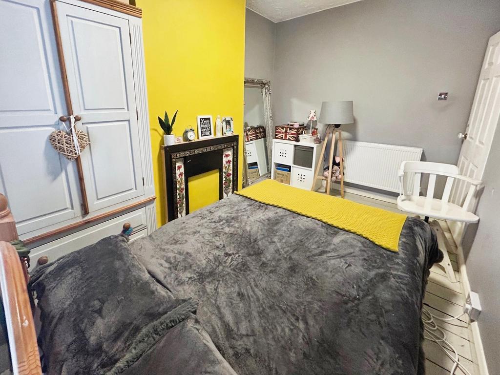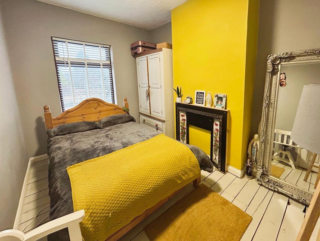 This main bedroom is a stylish and well-proportioned space with plenty of character. A striking feature wall in a bold yellow tone adds a modern touch, contrasting beautifully with the neutral grey walls. The original fireplace with decorative tiling serves as a charming focal point, enhancing the room’s period appeal. The wooden floorboards, painted in a light finish, contribute to the sense of space and complement the classic yet contemporary aesthetic. This inviting bedroom offers both comfort and style, making it a standout feature of the home.