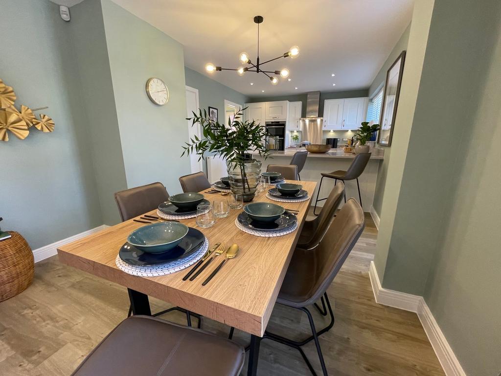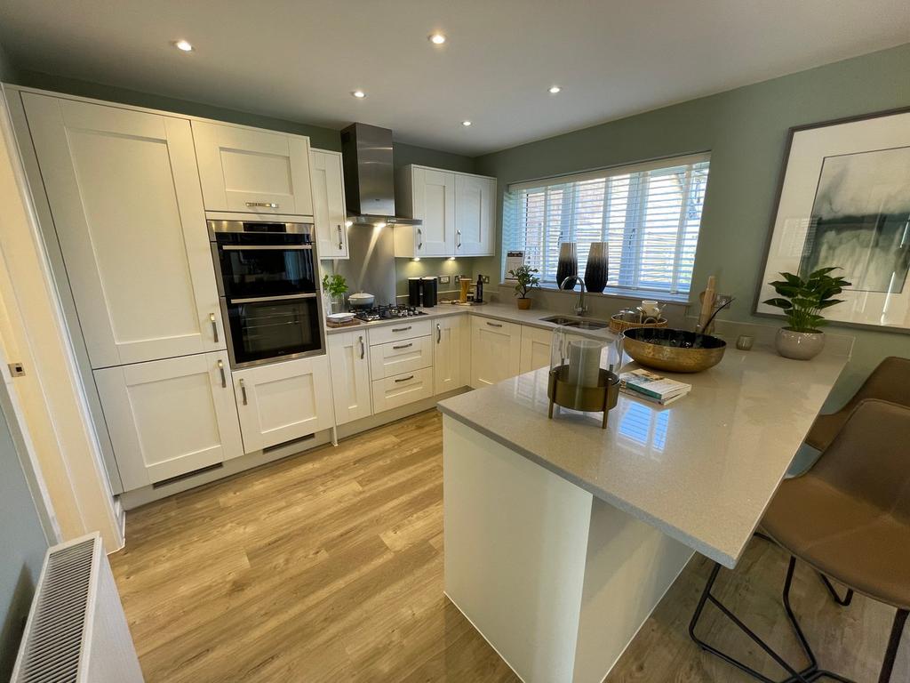 This beautifully designed four-bedroom home is an ideal choice for a starting family, offering a blend of traditional charm and modern living. At the front of the home, the spacious living room features a stunning bay window, providing picturesque views over green spaces and filling the room with natural light. Towards the rear, the open-plan kitchen and dining area creates a warm and welcoming space for family meals and entertaining, with French doors leading directly into the garden for effortless indoor-outdoor living. A separate utility room adds convenience, additional storage options on this floor help maintain a tidy and organized living space.