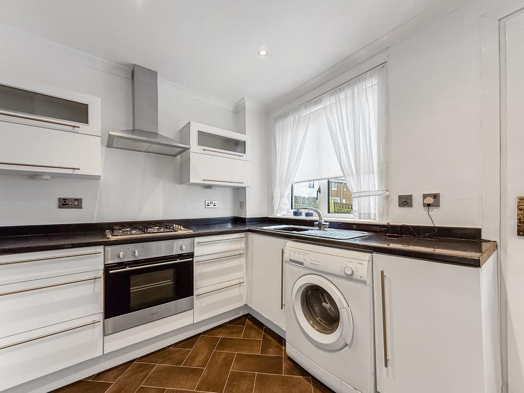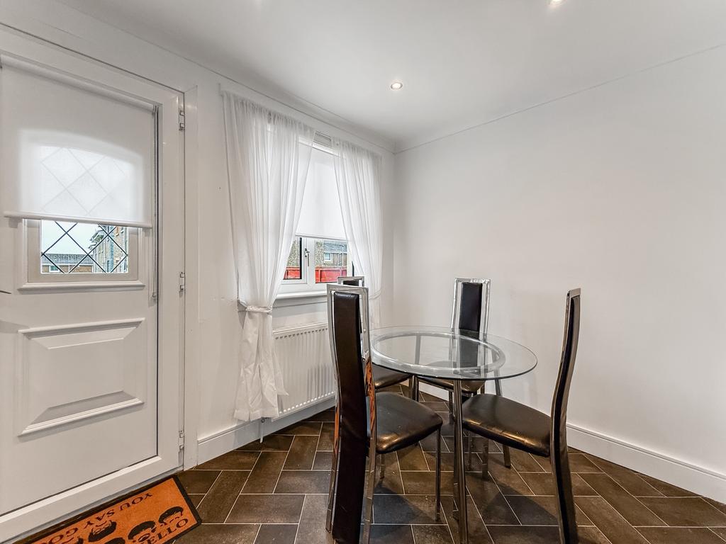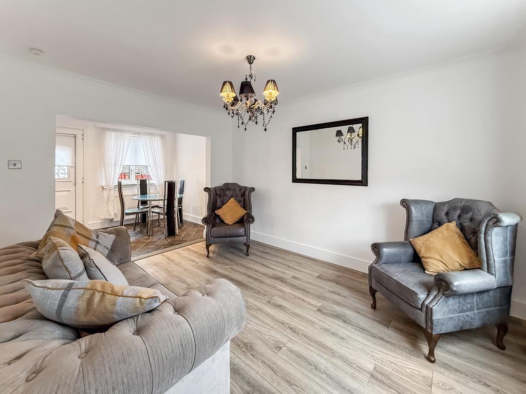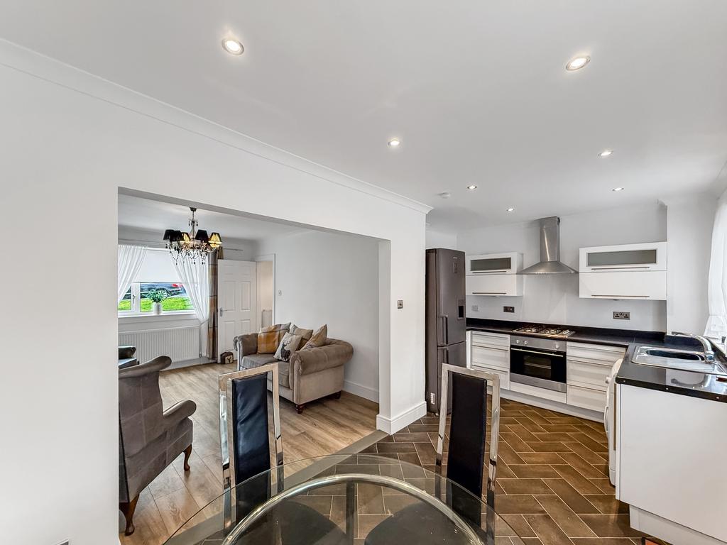The welcoming entrance hallway includes a large storage cupboard and leads to a bright and airy open-plan lounge, featuring modern laminate flooring. Flowing seamlessly into the dining area and kitchen, this well-planned L-shaped layout maximises space and functionality. The high-gloss white kitchen is fitted with an electric oven, gas hob, and chrome cooker hood, complemented by vinyl flooring. A door from the dining kitchen provides direct access to the private rear garden.