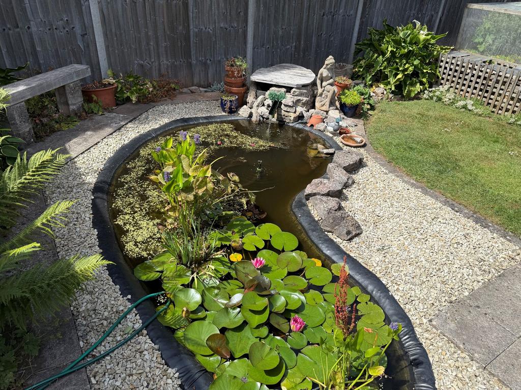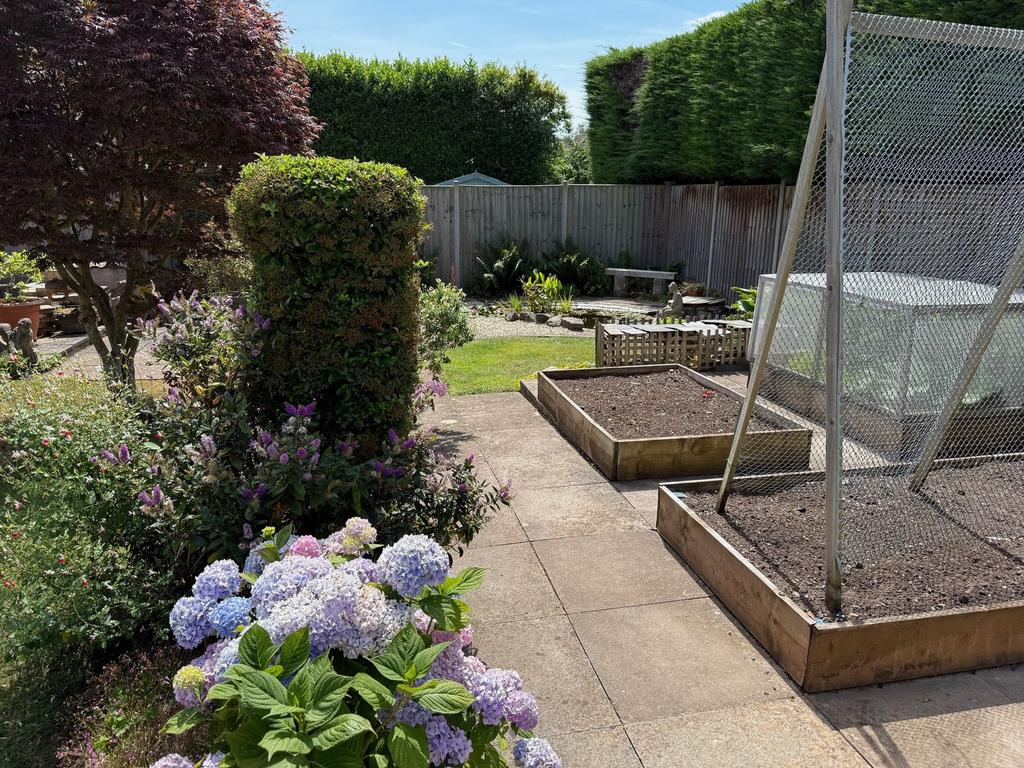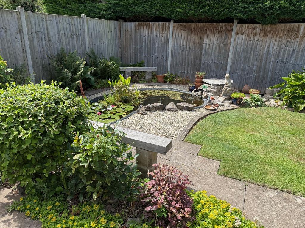 The rear garden is a true delight—westerly facing, mature, and beautifully landscaped. It offers a patio area, lawn, a diverse selection of plants, a pond, a vegetable patch, and a storage shed/workshop. Additionally, there is access to the garage and a convenient side entrance.