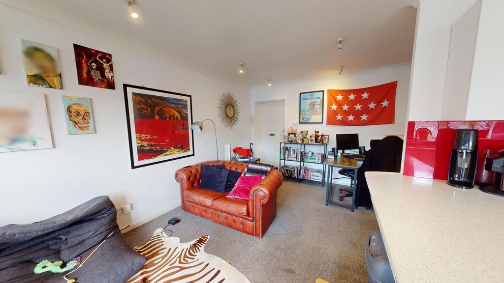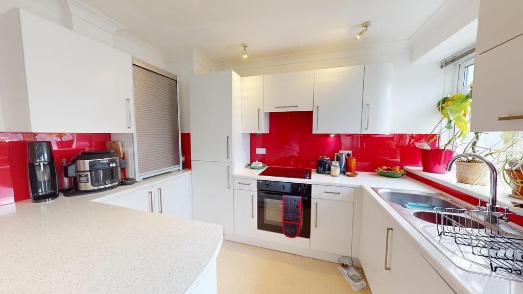 The flat is well presented throughout and offers an open-plan kitchen and living area, providing ample space for a dining table and chairs, along with built-in storage. The living area is bright and airy, thanks to large double patio doors and windows that allow plenty of natural light.