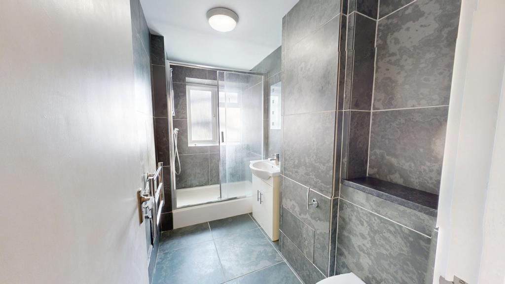 The modern kitchen includes generous worktop space and storage, making it practical and stylish. The contemporary bathroom features dark tiled walls, a full-length walk-in shower, a washbasin, and a toilet.